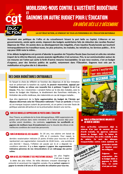 Ce que nous voulons, c’est un budget d’urgence, pour des Services publics de qualité, notamment dans l’Éducation. Gagnons tout cela par la mobilisation et la grève dès le 2 décembre.