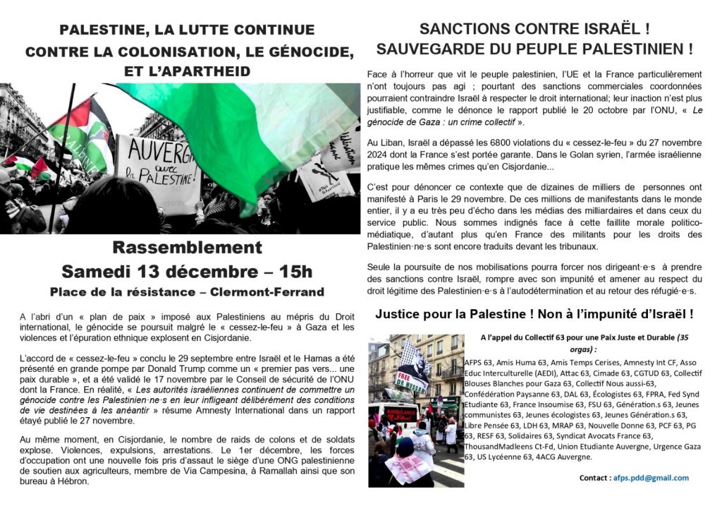 13.12 – Palestine : la lutte continue contre la colonisation, le génocide et l’apartheid 10 décembre 2025 / Puy-de-Dôme Rassemblement à Clermont-FdSamedi 13 décembre - 15h00Place de la Résistance