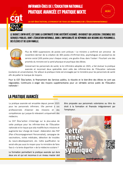 Concernant les personnels de santé, la loi infirmière adoptée en 2025, a fait évoluer la pratique avancée et reconnait deux spécialités, dont celle des infirmier·ères de l’Éducation nationale (scolaires et universitaires). Par ailleurs, la pratique mixte est envisagée par le ministère pour les personnels de santé afin de pallier le manque de