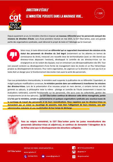 Direction d’école : le ministère persiste dans la mauvaise voie… 6 avril 2026 / Premier degré, Tract Avec son projet de référentiel de direction, le ministère persiste à vouloir transformer les directeur·trices en personnels de direction avec des missions élargies et une mainmise sur les personnels. Inacceptable pour la CGT Éducation. Cliquez sur l'image pour télécharger