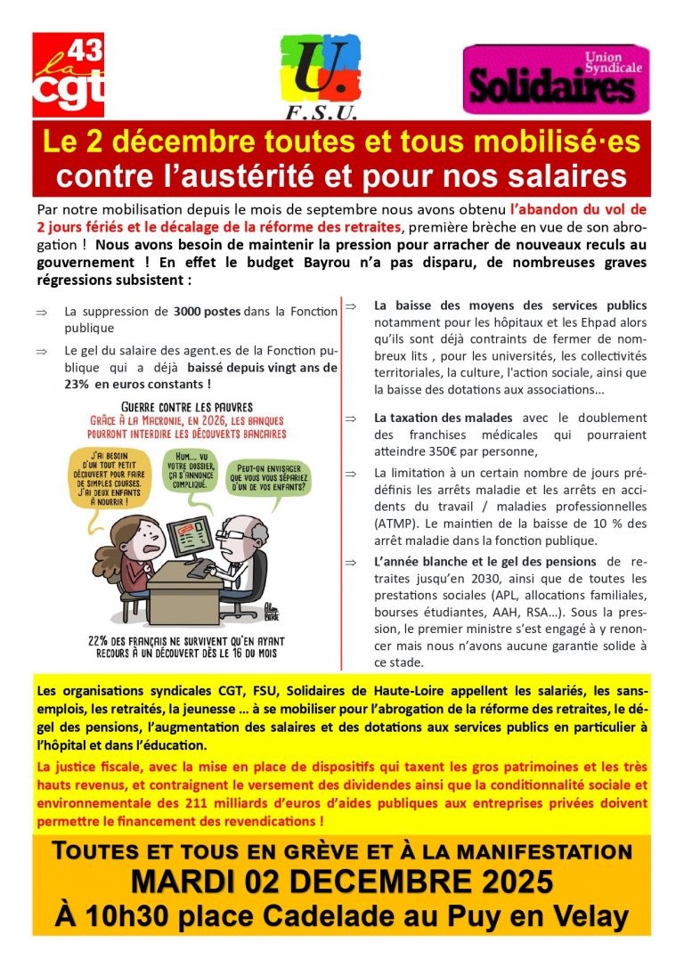 CGT EDUC'ACTION 43 Nous contacter ? Maison des syndicats5 rue de la Passerelle43000 LE PUY-EN-VELAY 06 25 23 56 89 43@cgteduc.fr Journal intersyndicalCGT-FSU-SUD 22 novembre 2022Lacharem Pas N° 5 – Novembre 2022 Tous les Lacharem Pas Notre actualité 26 novembre 2025Toutes et tous mobilisés le 2 décembre !13 octobre 2025Protection sociale complémentaire (PSC) : Foire aux questions3 avril 2025Grève des AED du 1er avril : une réussite dans notre académie !24 mars 2025Réunion publique sur les retraites4 février 2025Pétition – Non à la suppression d’un poste RPI Siaugues-Vissac-Auteyrac1 février 2025Pétition – Non à la fermeture d’une classe à l’école Lucie Aubrac de Monistrol-sur-Loire1 février 2025Pétition – Pour le maintien du dispositif “Enfants allophones” (UPE2A) à Langeac1 février 2025Pétition – Non à la fermeture d’une classe à l’école maternelle d’Yssingeaux28 novembre 2024En grève manif le 5 décembre !21 septembre 20241er octobre – En Grève et en Manif !17 mai 2024L’abandon du Lycée Pro A. Eymard à Espaly15 mai 2024NON au choc des savoirs, OUI au choc des moyens pour l’École publique !30 avril 2024Forte mobilisation contre le choc des savoirs au Puy !10 mars 202419 mars : En grève pour le dégel du point d’indice et contre le choc des savoirs6 mars 20248 mars : Syndicats et associations unis pour les droits des femmes Toute l'actualité de la Haute-Loire