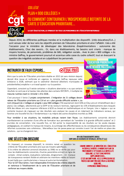 Depuis 2014, les différentes politiques menées et la multiplication des dispositifs (cités éducatives/CLA…) sont venues vider de leur sens les objectifs premiers de l’éducation prioritaire et ainsi l’affaiblir. Cela a été l’occasion pour le ministère de développer des laboratoires d’expérimentations : autonomie des établissements, Choc des savoirs… Or, dans ces établissements, les besoins sont criants : manque de moyens horaires, de personnels, problèmes de bâti, relégation sociale… Avec le plan « 800 collèges » du ministre Geffray, le gouvernement poursuit et accentue cette casse du cadre collectif, tout en évacuant la question des inégalités sociales et en culpabilisant les personnels.
