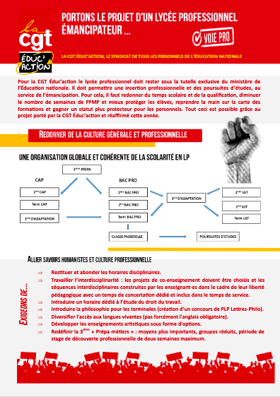 Pour la CGT Éduc’action le lycée professionnel doit rester sous la tutelle exclusive du ministère de l’Éducation nationale. Il doit permettre une insertion professionnelle et des poursuites d’études, au service de l’émancipation. Pour cela, il faut redonner du temps scolaire et de la qualification, diminuer le nombre de semaines de PFMP et mieux protéger les élèves, reprendre la main sur la carte des formations et gagner un statut plus protecteur pour les personnels.