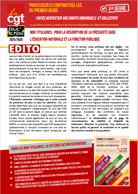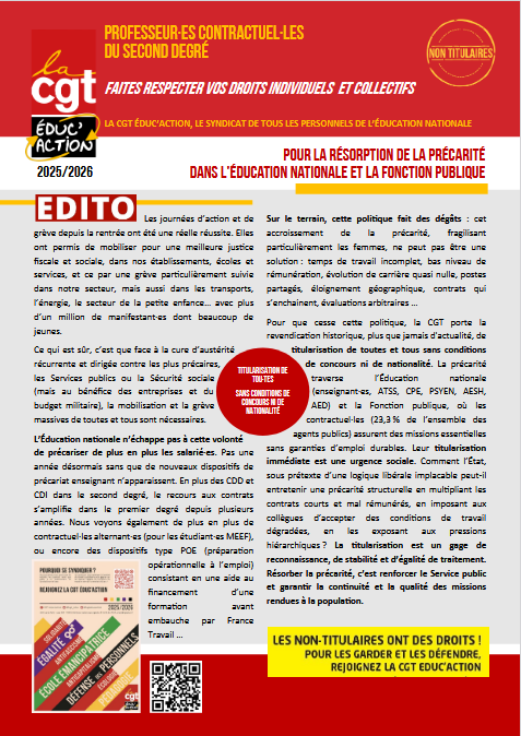 Pour que cesse cette politique, la CGT porte la revendication historique, plus que jamais d’actualité, de titularisation de toutes et tous sans conditions de concours ni de nationalité. La précarité traverse l’Éducation nationale (enseignant·es, ATSS, CPE, PSYEN, AESH, AED) et la Fonction publique, où les contractuel·les (23,3 % de l’ensemble des agents publics) assurent des missions essentielles sans garanties d’emploi durables. Leur titularisation immédiate est une urgence sociale. Comment l’État, sous prétexte d’une logique libérale implacable peut-il entretenir une précarité structurelle en multipliant les contrats courts et mal rémunérés, en imposant aux collègues d’accepter des conditions de travail dégradées, en les exposant aux pressions hiérarchiques ? La titularisation est un gage de reconnaissance, de stabilité et d’égalité de traitement. Résorber la précarité, c’est renforcer le Service public et garantir la continuité et la qualité des missions rendues à la population.
