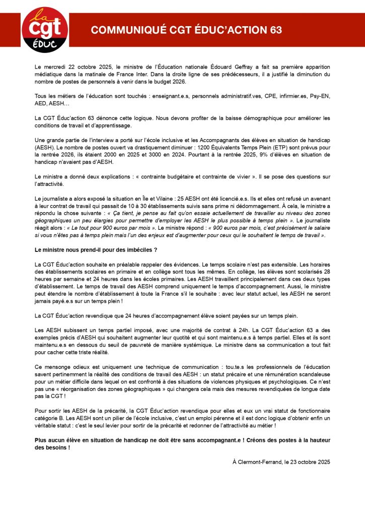 Première sortie médiatique de Geffray : Mépris toujours aussi grand pour les AESH ! 27 octobre 2025 / AESH, Puy-de-Dôme COMMUNIQUÉ CGT ÉDUC'ACTION 63