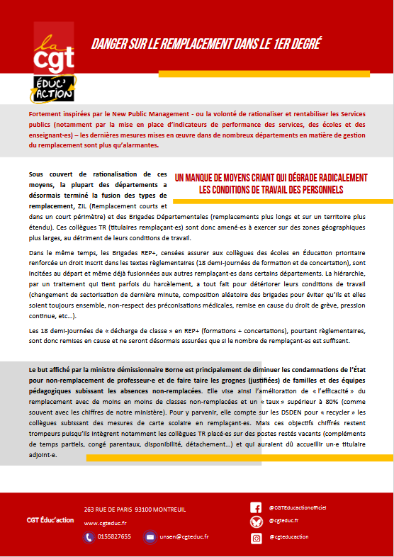 Fortement inspirées par le New Public Management et la volonté de rationaliser, les dernières mesures mises en œuvre dans de nombreux départements, sous l’impulsion ministérielle, en matière de gestion du remplacement sont alarmantes. Là aussi, il y a urgence à se mobiliser et s’opposer à cette politique.